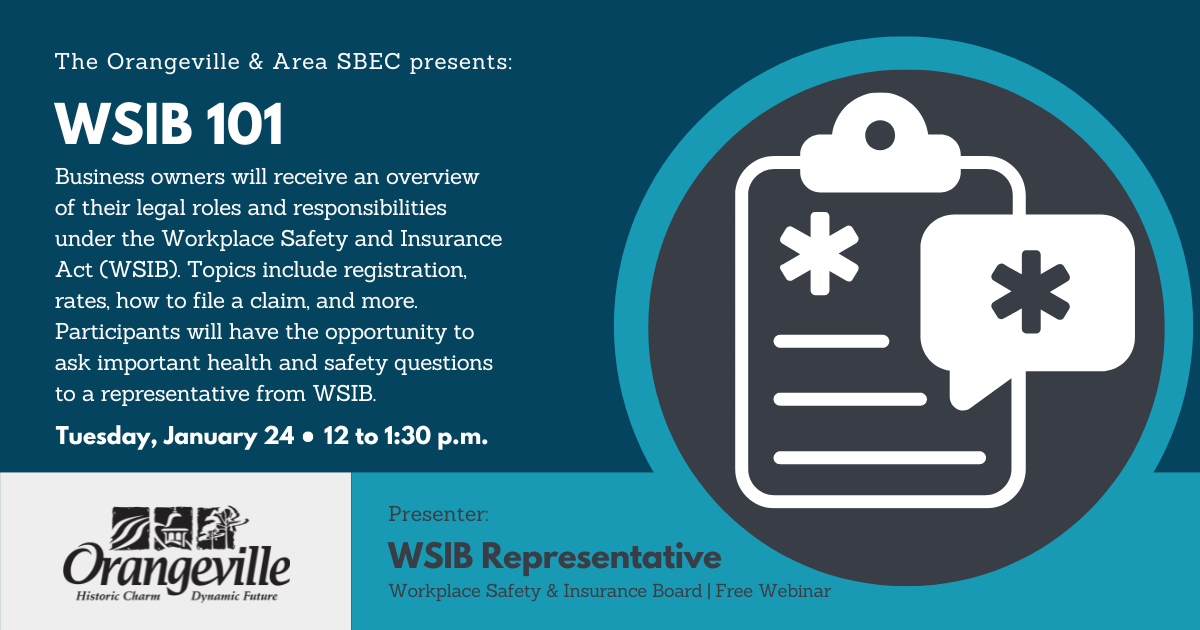The Workplace Safety and Insurance Board (WSIB) will provide business owners with an overview of their legal responsibilities under the Workplace Safety and Insurance Act. Attendees will learn about their roles and responsibilities as employers, who is required to register with WSIB and how to register, calculation of rates, how to file a claim, and the available free resources offered to small business by WSPS. Participants will have the opportunity to ask important health and safety questions to a representative from WSIB.