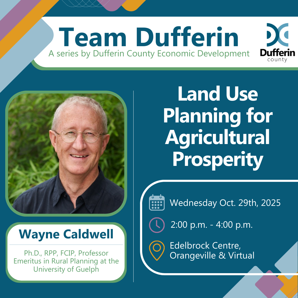 This presentation will explore how thoughtful land use planning can support agricultural prosperity in Dufferin County. It will address the pressures of urban encroachment and farmland loss, the current strengths and challenges of the agricultural sector, and the importance of looking beyond tariffs to consider broader agricultural issues. Emphasis will be placed on educating the wider community about agriculture, fostering stronger urban–rural connections, and highlighting how housing and workforce needs intersect with agricultural viability. The discussion will also consider municipal capacity to plan for and manage rural and agricultural issues effectively. Grounded in the fundamentals of planning, the presentation will outline strategies to ensure that agriculture continues to thrive as a cornerstone of community well-being and economic vitality.