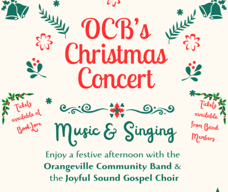 The Orangeville Community Band and the Joyful Sound Gospel Choir will host for a festive afternoon of music and singing on Saturday, December 9 from 3 to 5 p.m. Tickets can be purchased from Booklore, which is located at 121 First Street in Orangeville.