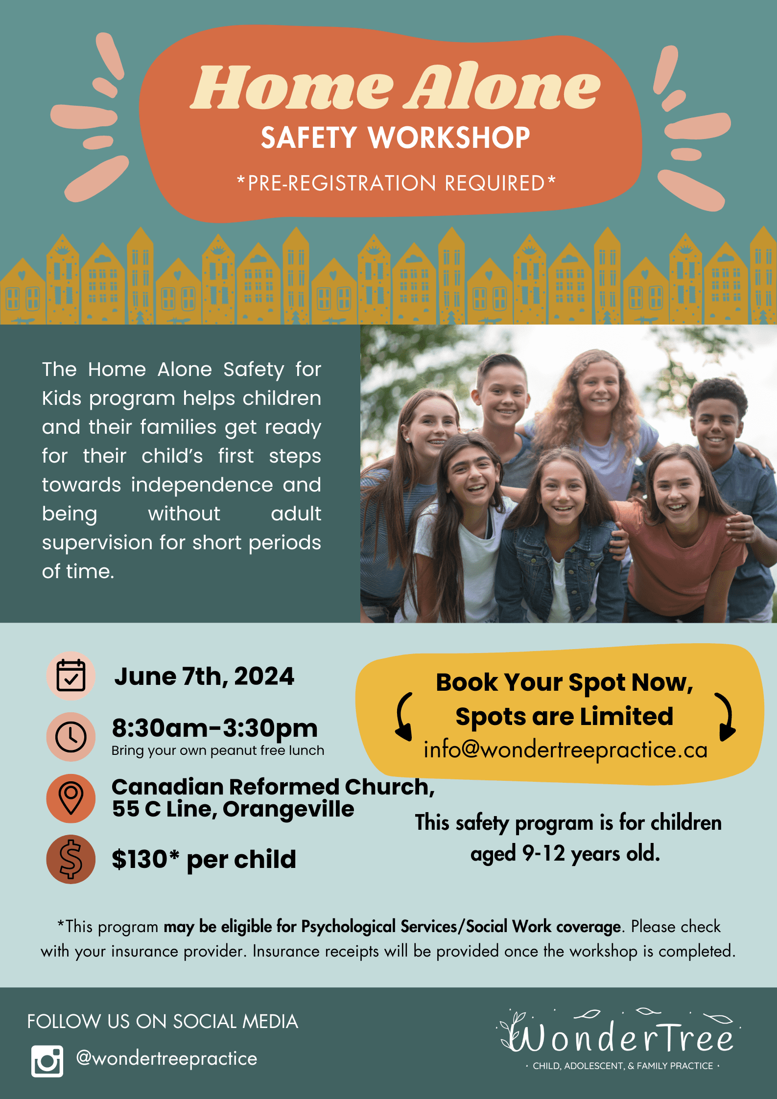 See the poster attached for more information. To register please email info@wondertreepractice.ca with the subject line - Home Alone- Orangeville. Registration forms will be sent to those who have expressed interest. The cost may be reimbursable by your insurance company if you have coverage for psychology or social worker services. Limited spots available (~20) so register quickly!