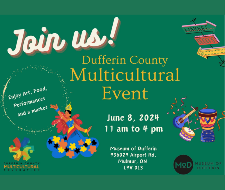 The Annual Dufferin County Multicultural Event celebrates the diversity and cultures found within the county. Held at the Museum of Dufferin the event will feature cultural arts, music, performances, food, and much more.