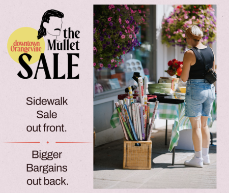 It’s a classic sidewalk sale up front—sales tables and racks set up right outside your favourite shops—and out back, it’s all about bold markdowns in Downtown Orangeville’s laneways, private lots, and hidden corners. A little gritty, totally fun, and full of unexpected finds around every turn—just like a great mullet.
