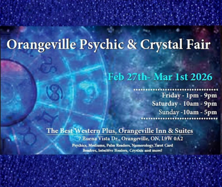 The Orangeville Psychic and Crystal Fair features psychics, mediums, palm readings, numerology, astrology, tarot card readings, intuitive healers, crystal vendors and more. Tickets can be purchased in advance or at the door.