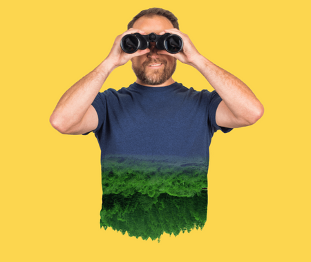 Image of a man holding binoculars to his eyes. He's wearing a shirt with trees printed on it and standing in front of a yellow background.